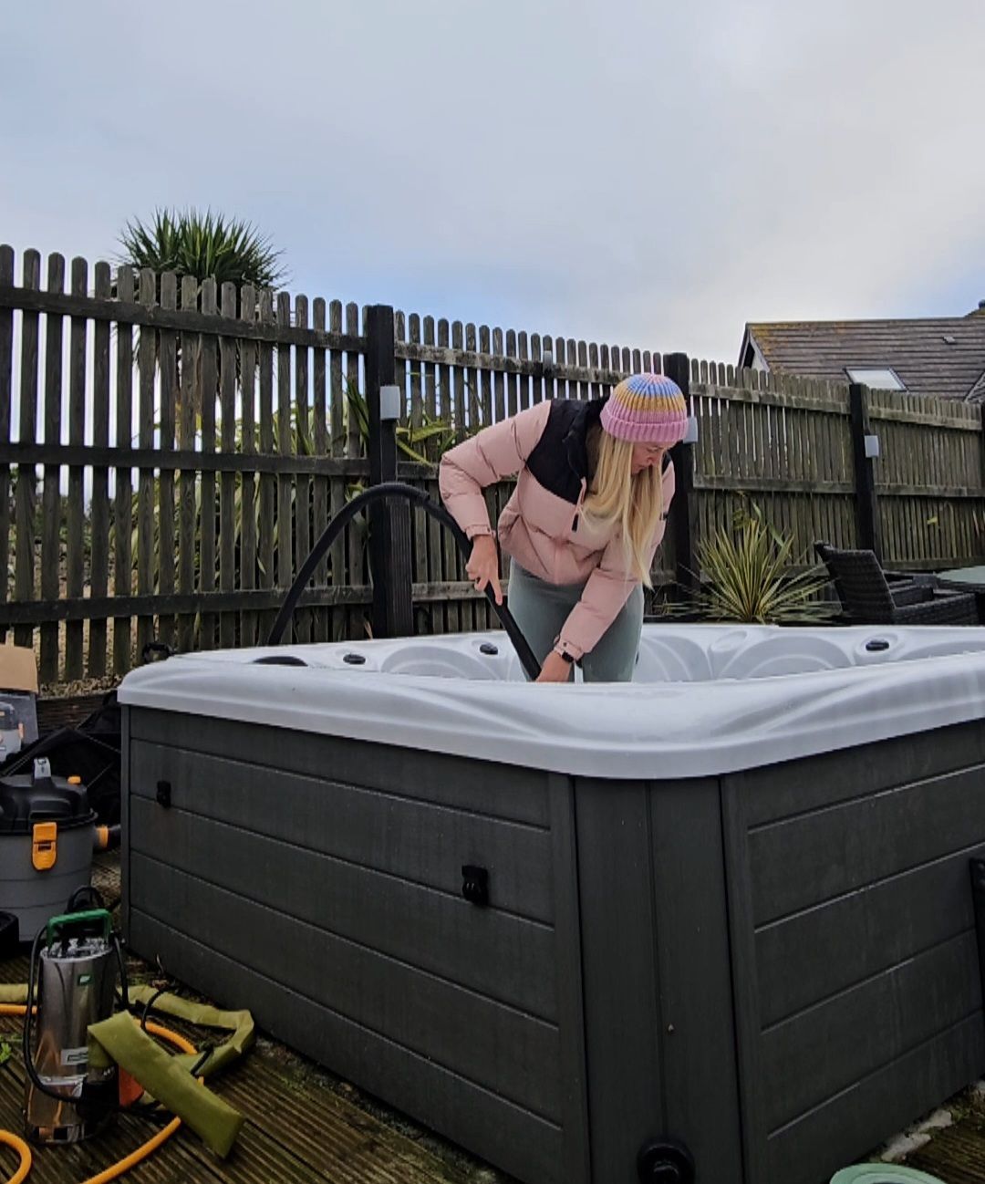 This includes vacuuming grit/sand etc on the bottom of the hot tub, changing filters, checking chlorine and topping up water levels if needed.